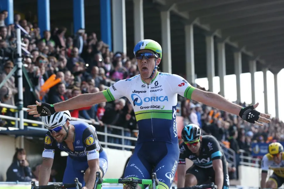 On the pavé of Paris-Roubaix, multiple crashes and splits wreaked havoc on the bunch. Hayman’s teammate Mitch Docker crashed so violently on Arenberg that he almost lost an eye. Eventually a five-man leading group would form in the chaos. Hayman was briefly dropped on the Carrefour de l’Arbre but battled his way back into contention and, as the kilometres ticked down, five became two.